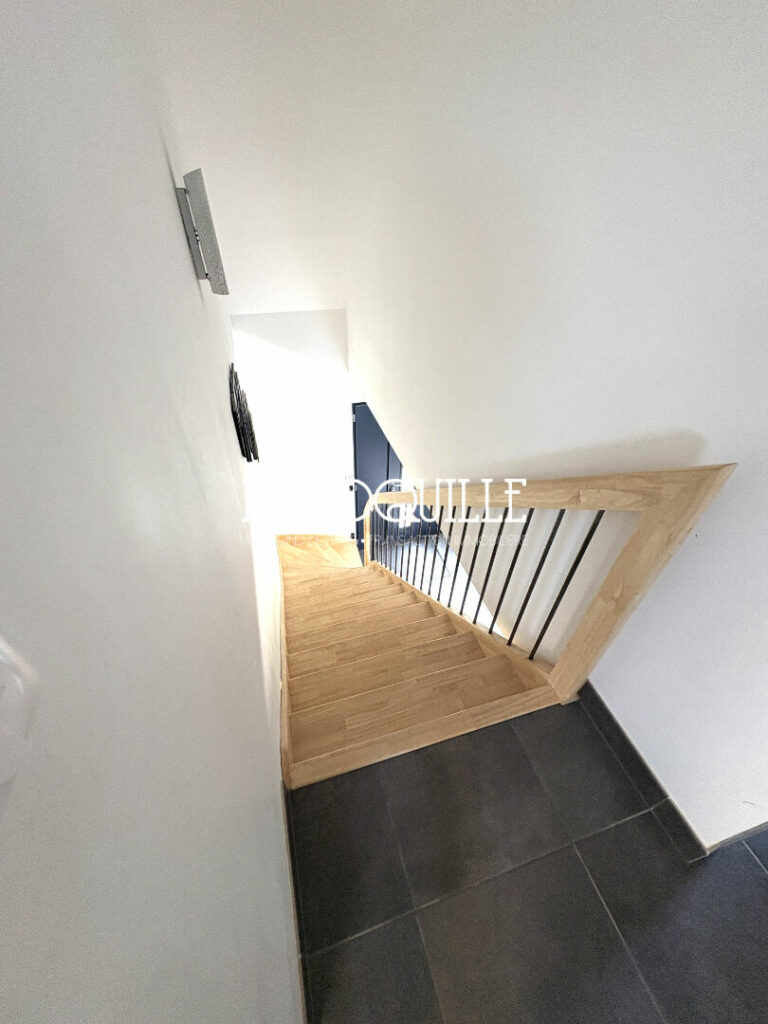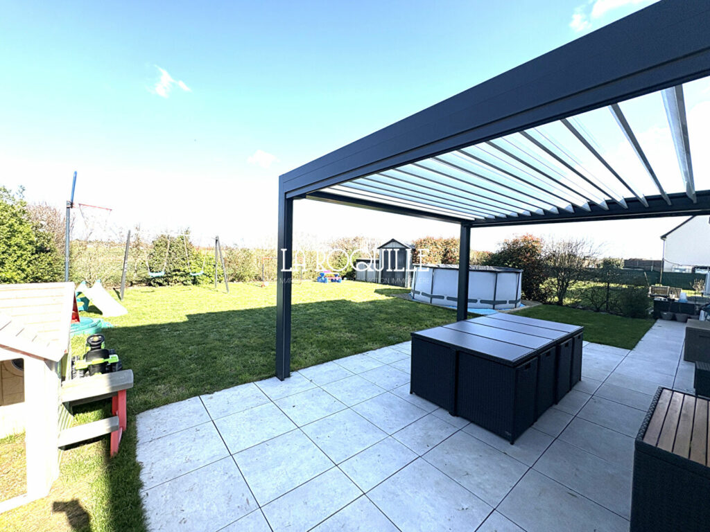 Elle comprend au rez de chaussée, une pièce de vie avec cuisine ouverte de plus de 50m² donnant sur une terrasse et sa pergola bioclimatique, une suite parentale avec salle de bain, un cellier et un WC. A l’étage, un palier desservant trois chambres et un bureau (actuellement utilisé en chambre), une salle d’eau et un WC.